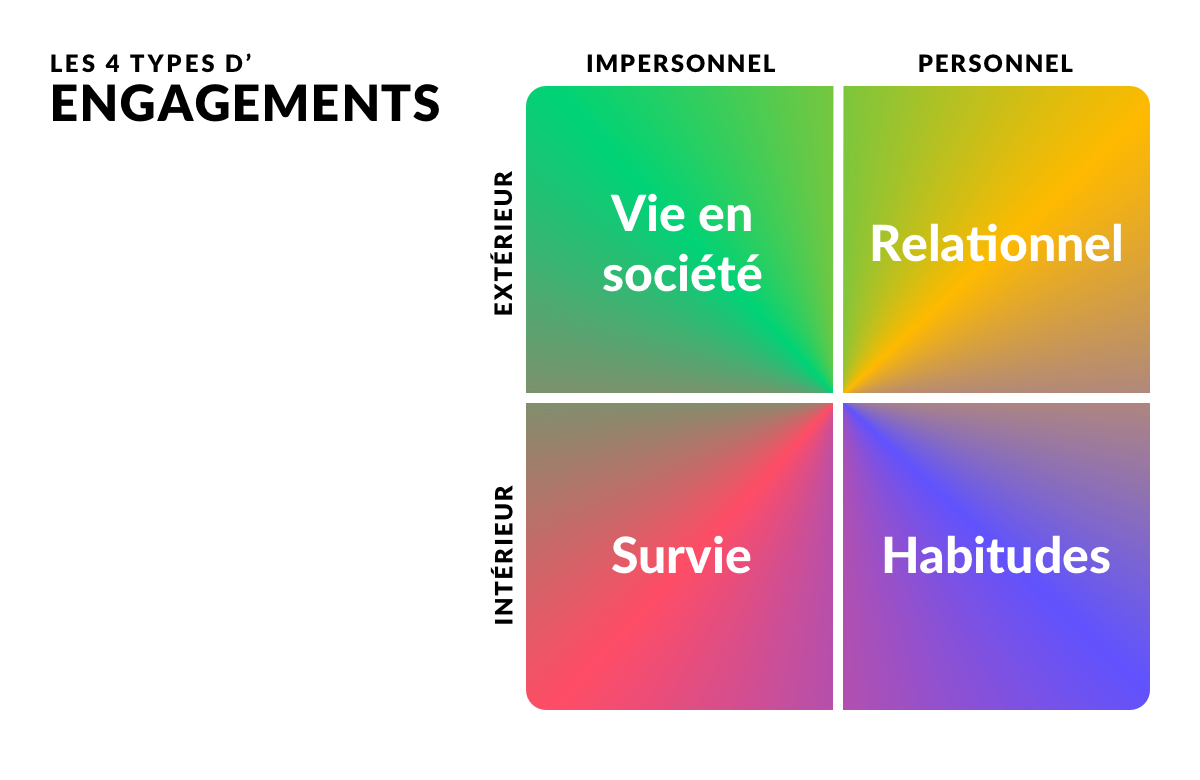 Pour rendre l’engagement plus lisible, Martin distingue 4 types d’engagement, calqués sur l’esprit de la pyramide de Maslow :