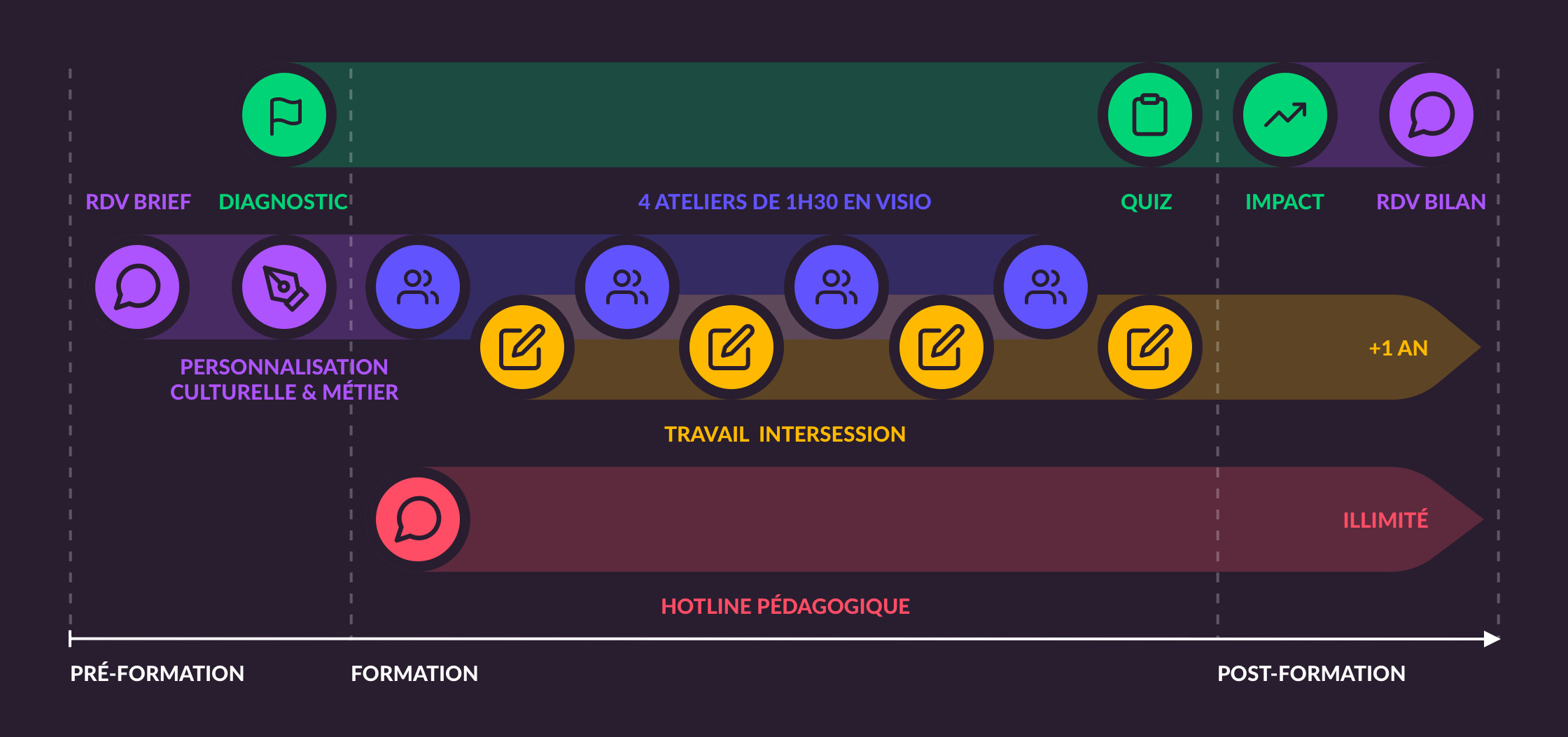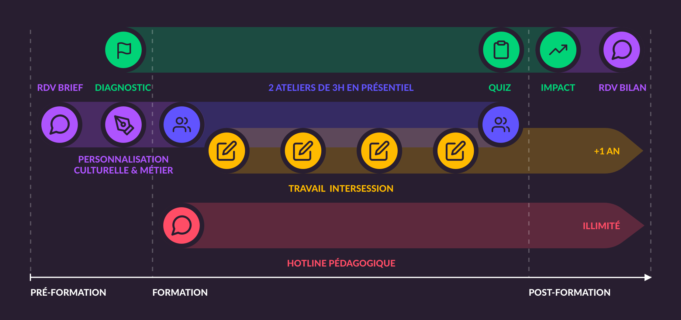 Finie les 1 à 2 jours de formation à l'impact limité. Notre parcours répartit ces heures sur plusieurs semaines pour un ancrage dans le temps et dans les pratiques.